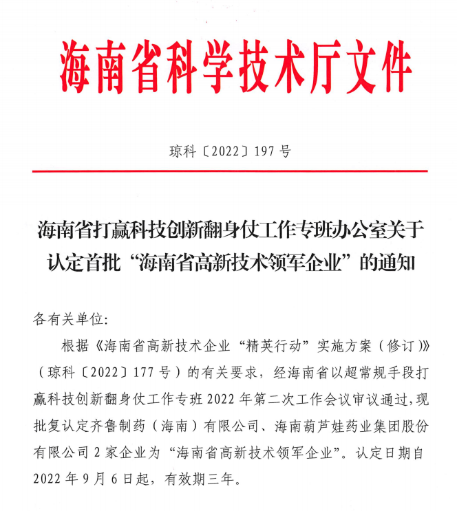 近日,海南省科学技术厅发布的《海南省打赢科技创新翻身仗工作专班办公室关于认定首批“海南省高新技术领军企业”的通知》中显示,批复认定海南PG电子药业集团股份有限公司等2家企业为“海南省高新技术领军企业”。认定日期自2022年9月6日起,有效期三年。
