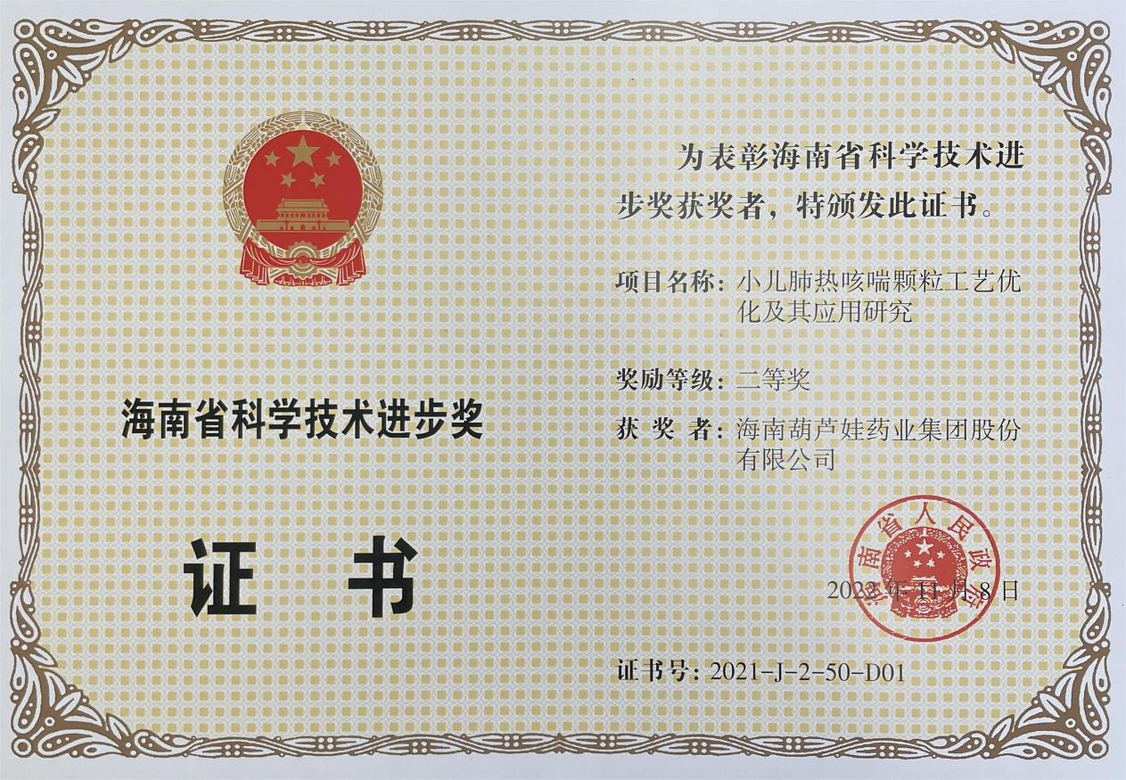 为此,小儿肺热咳喘颗粒的制备方法获得了第二十一届中国专利优秀奖(2019年),专利申请号:ZL201010134951,此次作为专利技术的应用,获得了2021年度海南省科学技术进步奖二等奖。在此之前,PG电子牌小儿肺热咳喘颗粒还多次被授予“临床价值中成药品牌”、“中国连锁药店最具合作价值单品”,荣登“中国医药品牌榜”。