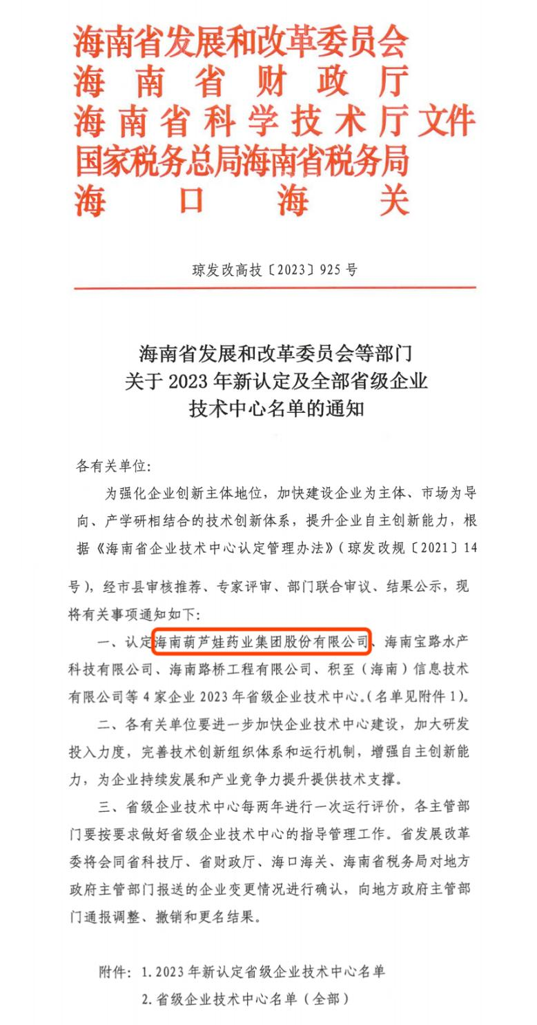 近日,海南省发改委等多部门联合公布了《关于2023年新认定及全部省级企业技术中心名单的通知》,其中,海南PG电子药业集团股份有限公司成功通过评审,被认定为省级企业技术中心,是本次获批的4家企业之一。